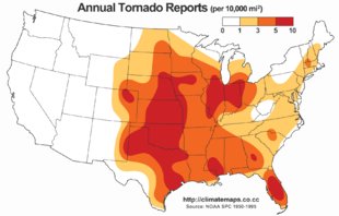 Canada annually experiences numerous tornadoes, although fewer than the United States. On average 62 are reported per year, but this number is expected to in fact be higher due to undetected tornadoes in large expanses of underpopulated areas.[13] NOAA records a higher average of 100 per year in Canada.[14] These storms cause tens of millions of dollars in damage. Most are weak F0 or F1 in intensity, but there are on average a few F2 or stronger that touch down each season.