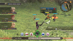 Several other systems are present which affect the flow of battle. The "Party Gauge" slowly fills as party members successfully land hits on enemies, and filling the gauge allows the player to perform a Chain Attack for extra damage.[17] All party members have an "aggro ring" around them as well; it grows larger as a character performs more actions. Larger aggro rings lead enemies to focus their efforts on that respective character, leading to a strategic aspect of luring and diverting the attention of enemies.[16] Each character has a "Tension" gauge, which represents their morale: at its highest point, characters have increased accuracy and a higher chance to deal critical hits.[9] The game's "Vision" system, where the main character Shulk can see glimpses of enemies' future attacks, also factors into battles. With knowledge of an enemy's potentially dangerous attack, the player can prevent it from happening by alerting a teammate, allowing the player to activate one of their Arts, or by using an Art of their own to stop the attack.[18] The Vision system is tied to the "Party" gauge, which is filled by boosting team morale, using Arts with special effects, and avoiding or dealing critical hits. The three-tiered gauge gradually depletes outside of battle, and one tier is needed to either revive characters or alert a teammate to a vision. When all three tiers are full, the party can execute a Chain Attack.[9]