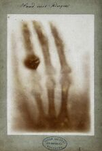 Röntgen discovered X-rays' medical use when he made a picture of his wife's hand on a photographic plate formed due to X-rays. The photograph of his wife's hand was the first ever photograph of a human body part using X-rays. When she saw the picture, she said, "I have seen my death."[9]