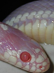 In snakes, partial absence of pigment is more common than absolute albinism. For snakes that are usually patterned in colours, they appear as a faint blue, peach or yellowish. In these cases, there has been a genetic mutation in the melanin and pigment delivery. The appearance comes from the inability for full colours to be present, such as black, red, brown and others. The eyes of an albino snake are typically red or pink. Albino snakes can remain in the sunlight for several hours with minimal harm. Corn snakes and snakes of larger types, such as a boa or diamondback snakes, are the most commonly affected by albinism often appearing to be a pinkish or yellowish colour.[20]
