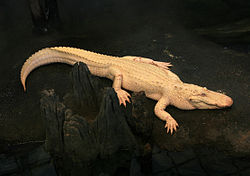 The California Academy of Science, in the Steinhart Aquarium, as of 2015, has on display an albino American alligator named "Claude". The alligator is partially blind because of lack of pigment in its eyes.[52] The albino alligator hatched from the egg in 1995 in Florida, and was brought to the Academy in 2008. This alligator would not have survived in the wild because its whiteness would have made it too easy a prey object. The only known albino alligators are in captivity.[53] While extremely rare, white-colored crocodiles and alligators do exist in other places. However, most of these animals are leucistic given that they have a general loss of pigmentation with some color tinges remaining on their bodies although looking at first like other albino creatures, thus creating the misconception that the reptiles are albino themselves when they are not. Four such alligators are kept at the Gatorland theme park in the U.S. state of Florida.[54] In Australia, a crocodile believed to be "part-albino" and nicknamed by people in the area as "Michael Jackson", attacked and killed a man.[55]