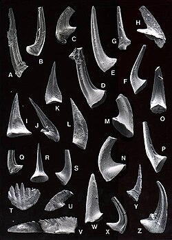From Rationalwiki The Conodonts ("cone-teeth") are a group of extinct chordates (possibly fish) which existed from the Late Cambrian to the start of the Jurassic from 540 to 195 million years ago. For over 150 years until 1993 and 1994 bafflingly, only the calcium phosphate teeth were known, then fossils in the Ordovician strata of South Africa, and Scotland showed what the owners of these teeth looked like.[1] There are only three genera of conodonts with body fossils, those being Promissum