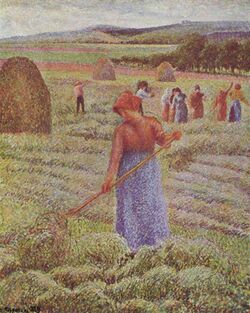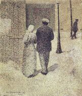 The Post-Impressionists were dissatisfied with what they felt was the triviality of subject matter and the loss of structure in Impressionist paintings, though they did not agree on the way forward. Georges Seurat and his followers concerned themselves with pointillism, the systematic use of tiny dots of colour. Paul Cézanne set out to restore a sense of order and structure to painting, to "make of Impressionism something solid and durable, like the art of the museums".[5] He achieved this by reducing objects to their basic shapes while retaining the saturated colours of Impressionism. The Impressionist Camille Pissarro experimented with Neo-Impressionist ideas between the mid-1880s and the early 1890s. Discontented with what he referred to as romantic Impressionism, he investigated pointillism, which he called scientific Impressionism, before returning to a purer Impressionism in the last decade of his life.[6] Vincent van Gogh often used vibrant colour and conspicuous brushstrokes to convey his feelings and his state of mind.