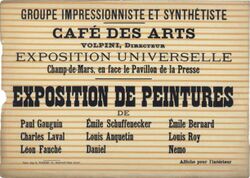 Most of the artists in Fry's exhibition were younger than the Impressionists. Fry later explained: "For purposes of convenience, it was necessary to give these artists a name, and I chose, as being the vaguest and most non-committal, the name of Post-Impressionism. This merely stated their position in time relatively to the Impressionist movement."[9] John Rewald limited the scope to the years between 1886 and 1892 in his pioneering publication on Post-Impressionism: From Van Gogh to Gauguin (1956). Rewald considered this a continuation of his 1946 study, History of Impressionism, and pointed out that a "subsequent volume dedicated to the second half of the post-impressionist period":[10] Post-Impressionism: From Gauguin to Matisse, was to follow. This volume would extend the period covered to other artistic movements derived from Impressionism, though confined to the late 19th and early 20th centuries. Rewald focused on such outstanding early Post-Impressionists active in France as van Gogh, Gauguin, Seurat, and Redon. He explored their relationships as well as the artistic circles they frequented (or were in opposition to), including: