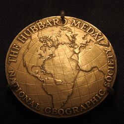 The Hubbard Medal is awarded by the National Geographic Society for distinction in exploration, discovery, and research. The medal is named for Gardiner Greene Hubbard, the first National Geographic Society president. The Hubbard Medal has been presented 44 times (As of 2018), the most recent award going to Peter H. Raven.[23]