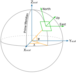 where [math]\displaystyle{ \mathbf p_{\mathrm{NED}} }[/math] is a 3D position in a NED system, [math]\displaystyle{ \mathbf p_{\mathrm{ECEF}} }[/math] is the corresponding ECEF position, [math]\displaystyle{ \mathbf p_{\mathrm{Ref}} }[/math] is the reference ECEF position (where the local tangent plane originates), and [math]\displaystyle{ R }[/math] is a rotation matrix whose columns are the north, east, and down axes. [math]\displaystyle{ R }[/math] may be defined conveniently from the latitude [math]\displaystyle{ \phi }[/math] and longitude [math]\displaystyle{ \lambda }[/math] corresponding to [math]\displaystyle{ \mathbf p_{\mathrm{Ref}} }[/math]: