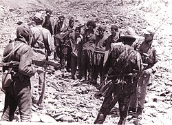 Around half a million civilians were killed in the war.[8] A 1987 survey estimated around 46% of the deaths were due to Soviet bombings, and 80% of those killed were civilians.[8] The war was most deadly under Andropov and Chernenko.[8] Over a quarter of those killed in the war were women and girls.[8] When the communist dictatorship retook Herat after a coup; they killed over 20,000 civilians in the successive aerial bombardment in their suppression of the uprising.[8] The civilian death rate was reportedly higher than the civil war period in the 1990s.[8] American professor Samuel Totten, Australian professor Paul R. Bartrop, scholars from Yale Law School such as W. Michael Reisman and Charles Norchi, as well as scholar Mohammed Kakar have called the Soviet campaign in Afghanistan genocide.[9][10][11] Afghan women were abducted in broad daylight into helicopters, tanks, and military vehicles to be raped.[11] One third of the entire population of Afghanistan was displaced in the war.[12] 1.2 million[13] Afghans were disabled by the war, and 3 million[13] were maimed.