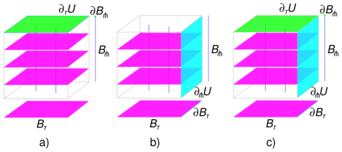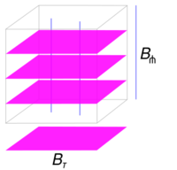 The foliated chart is the basic model for all foliations, the plaques being the leaves. The notation Bτ is read as "B-tangential" and [math]\displaystyle{ B_{\pitchfork} }[/math] as "B-transverse". There are also various possibilities. If both [math]\displaystyle{ B_{\pitchfork} }[/math] and Bτ have empty boundary, the foliated chart models codimension-q foliations of n-manifolds without boundary. If one, but not both of these rectangular neighborhoods has boundary, the foliated chart models the various possibilities for foliations of n-manifolds with boundary and without corners. Specifically, if ∂[math]\displaystyle{ B_{\pitchfork} }[/math] ≠ ∅ = ∂Bτ, then ∂U = ∂τU is a union of plaques and the foliation by plaques is tangent to the boundary. If ∂Bτ ≠ ∅ = ∂[math]\displaystyle{ B_{\pitchfork} }[/math], then ∂U = [math]\displaystyle{ \partial_{\pitchfork}U }[/math] is a union of transversals and the foliation is transverse to the boundary. Finally, if ∂[math]\displaystyle{ B_{\pitchfork} }[/math] ≠ ∅ ≠ ∂Bτ, this is a model of a foliated manifold with a corner separating the tangential boundary from the transverse boundary.[7]