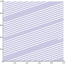 To see this, note first that, if a leaf [math]\displaystyle{ \tilde{L} }[/math] of [math]\displaystyle{ \mathcal{\tilde{F}} }[/math] does not project one-to-one into T2, there must be a real number t ≠ 0 such that ta and tb are both integers. But this would imply that b/a ∈ Q. In order to show that each leaf L of [math]\displaystyle{ \mathcal{F} }[/math] is dense in T2, it is enough to show that, for every v ∈ R2, each leaf [math]\displaystyle{ \tilde{L} }[/math] of [math]\displaystyle{ \mathcal{\tilde{F}} }[/math] achieves arbitrarily small positive distances from suitable points of the coset v + Z2. A suitable translation in R2 allows one to assume that v = 0; so the task is reduced to showing that [math]\displaystyle{ \tilde{L} }[/math] passes arbitrarily close to suitable points (n,m) ∈ Z2. The line [math]\displaystyle{ \tilde{L} }[/math] has slope-intercept equation
