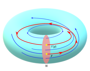 The term "first return (recurrence) map" comes from the theory of dynamical systems. Let Φt be a nonsingular Cr flow (r ≥ 1) on the compact n-manifold M. In applications, one can imagine that M is a cyclotron or some closed loop with fluid flow. If M has a boundary, the flow is assumed to be tangent to the boundary. The flow generates a 1-dimensional foliation [math]\displaystyle{ \mathcal{F} }[/math]. If one remembers the positive direction of flow, but otherwise forgets the parametrization (shape of trajectory, velocity, etc.), the underlying foliation [math]\displaystyle{ \mathcal{F} }[/math] is said to be oriented. Suppose that the flow admits a global cross section N. That is, N is a compact, properly embedded, Cr submanifold of M of dimension n – 1, the foliation [math]\displaystyle{ \mathcal{F} }[/math] is transverse to N, and every flow line meets N. Because the dimensions of N and of the leaves are complementary, the transversality condition is that