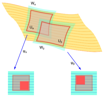 There is an atlas [math]\displaystyle{ \mathcal{U} }[/math] = {Uα,xα}α∈A on B, consisting of open, connected coordinate charts, together with trivializations φα : π−1(Uα) → Uα × F that carry [math]\displaystyle{ \mathcal{F} }[/math]|π−1(Uα) to the product foliation. Set Wα = π−1(Uα) and write φα = (xα,yα) where (by abuse of notation) xα represents xα ∘ π and yα : π−1(Uα) → F is the submersion obtained by composing φα with the canonical projection Uα × F → F.