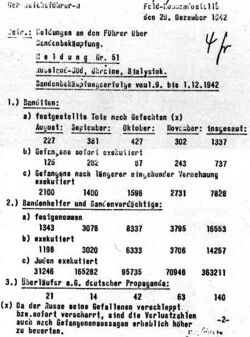 Congruent with the evidence that shows Hitler was responsible for the order to kill Jews, there is also evidence that shows he was made aware of the process. In December 1942 Hitler received a document from Himmler entitled, "Report to the Führer on Combating Partisans", stating that 363,211 Jews had been killed by the Einsatzgruppen in August–November 1942.[40] This document was marked "Shown to the Führer".[10]
