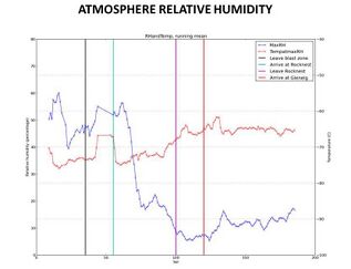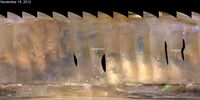 Currently, the atmosphere is very thin. For many years, it was assumed that as with the Earth, most of the early carbon dioxide was locked up in minerals, called carbonates. However, despite the use of many orbiting instruments that looked for carbonates, very few carbonate deposits have been found.[40][41] Today, it is thought that much of the carbon dioxide in the Martian air was removed by the solar wind. Researchers have discovered a two-step process that sends the gas into space.[42] Ultraviolet light from the Sun could strike a carbon dioxide molecule, breaking it into carbon monoxide and oxygen. A second photon of ultraviolet light could subsequently break the carbon monoxide into oxygen and carbon which would get enough energy to escape the planet. In this process the light isotope of carbon (12C) would be most likely to leave the atmosphere. Hence, the carbon dioxide left in the atmosphere would be enriched with the heavy isotope (13C).[43] This higher level of the heavy isotope is what was found by the Curiosity rover on Mars.[44][45] Climate data for the Gale Crater is provided here below, with the seasons normalized to those of Earth. Script error: No such module "weather box".