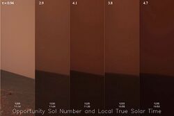 Observation since the 1950s has shown that the chances of a planet-wide dust storm in a particular Martian year are approximately one in three.[69]