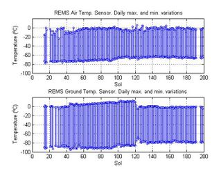 Before and after the Viking missions, newer, more advanced Martian temperatures were determined from Earth via microwave spectroscopy. As the microwave beam, of under 1 arcminute, is larger than the disk of the planet, the results are global averages.[31] Later, the Mars Global Surveyor's Thermal Emission Spectrometer and to a lesser extent 2001 Mars Odyssey's THEMIS could not merely reproduce infrared measurements but intercompare lander, rover, and Earth microwave data. The Mars Reconnaissance Orbiter's Mars Climate Sounder can similarly derive atmospheric profiles. The datasets "suggest generally colder atmospheric temperatures and lower dust loading in recent decades on Mars than during the Viking Mission,"[32] although Viking data had previously been revised downward.[33] The TES data indicates "Much colder (10–20 K) global atmospheric temperatures were observed during the 1997 versus 1977 perihelion periods" and "that the global aphelion atmosphere of Mars is colder, less dusty, and cloudier than indicated by the established Viking climatology," again, taking into account the Wilson and Richardson revisions to Viking data.[34]