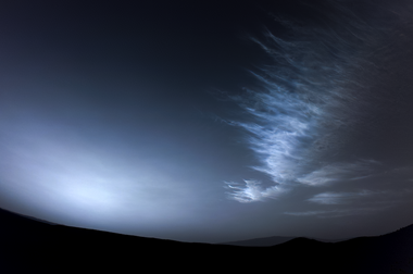 Martian dust storms can kick up fine particles in the atmosphere around which clouds can form. These clouds can form very high up, up to 100 km (62 mi) above the planet.[16] The first images of Mars sent by Mariner 4 showed visible clouds in Mars' upper atmosphere. The clouds are very faint and can only be seen reflecting sunlight against the darkness of the night sky. In that respect, they look similar to mesospheric clouds, also known as noctilucent clouds, on Earth, which occur about 80 km (50 mi) above our planet.