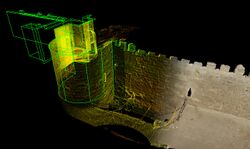 Aleppo underwent major transformations in the Ayyubid period, specifically during the reign of az-Zahir Ghazi. Ayyubid architectural achievements focused on four areas: the citadel, the waterworks, fortifications, and the extramural developments. The total rebuilding of the city enclosure began when az-Zahir Ghazi removed the vallum of Nur ad-Din—which by then outlived its temporary need—and rebuilt the northern and northwestern walls—the most susceptible to outside attack—from Bab al-Jinan to Bab al-Nasr. He parceled out the building of the towers on this stretch of the wall to his princes and military officers; each tower was identified with a particular prince who inscribed his name into it. Later, az-Zahir Ghazi extended the eastern wall to the south and east, reflecting his desire to incorporate a dilapidated fortress, Qala'at al-Sharif, outside the city into Aleppo's enclosure.[134] Bab Qinnasrin was completely rebuilt by an-Nasir Yusuf in 1256. This gate stands today as a masterpiece of medieval Syrian military architecture.[135] Cumulatively, Ayyubid architecture left a lasting impression in Aleppo. The citadel was rebuilt, the water network was expanded, and streets and quarters were provided fountains and baths. In addition, dozens of shrines, mosques, madrasas, and mausoleums were built throughout the city.[136]