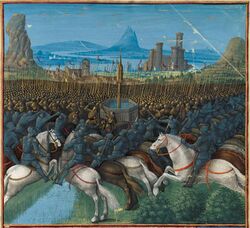 Saladin besieged Tiberias in the eastern Galilee on 3 July 1187 and the Crusader army attempted to attack the Ayyubids by way of Kafr Kanna. After hearing of the Crusaders' march, Saladin led his guard back to their main camp at Kafr Sabt, leaving a small detachment at Tiberias. With a clear view of the Crusader army, Saladin ordered al-Muzaffar Umar to block the Crusaders' entry from Hattin by taking a position near Lubya, while Gökböri and his troops were stationed at a hill near al-Shajara. On 4 July the Crusaders advanced toward the Horns of Hattin and charged against the Muslim forces, but were overwhelmed and defeated decisively. Four days after the battle, Saladin invited al-Adil to join him in the reconquest of Palestine, Galilee and Lebanese coast. On 8 July the Crusader stronghold of Acre was captured by Saladin, while his forces seized Nazareth and Saffuriya; other brigades took Haifa, Caesarea, Sebastia and Nablus, while al-Adil conquered Mirabel and Jaffa. On 26 July, Saladin returned to the coast and received the surrender of Sarepta, Sidon, Beirut, and Jableh.[51] In August, the Ayyubids conquered Ramla, Darum, Gaza, Bayt Jibrin, and Latrun. Ascalon was taken on 4 September.[52] In September–October 1187, the Ayyubids besieged Jerusalem, taking possession of it on 2 October, after negotiations with Balian of Ibelin.[53]