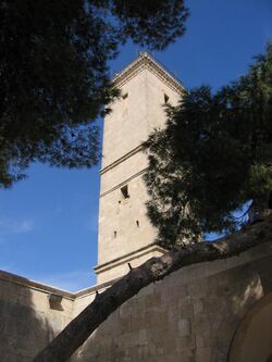 In September 1176, construction of the Cairo Citadel began under Saladin's orders. According to al-Maqrizi, Saladin chose the Muqattam Hills to build the citadel because the air there was fresher than anywhere else in the city, but its construction was not so much determined by the salubrious atmosphere; rather it was out of defensive necessity and example of existing fortresses and citadels in Syria. The walls and towers of the northern section of the citadel are largely the works of Saladin and al-Kamil.[130] Al-Kamil completed the citadel; he strengthened and enlarged some of the existing towers (such as two of Saladin's towers that were enlarged by totally encasing them in semi-circular units), and also added a number of square towers which served as self-contained keeps. According to Richard Yeomans, the most impressive of al-Kamil's structures was the series of massive rectangular keeps which straddled the walls of the northern enclosure.[133] All of al-Kamil's fortifications can be identified by their embossed, rusticated masonry, whereas Saladin's towers have smooth dressed stones. This heavier rustic style became a common feature in other Ayyubid fortifications, and can be seen in the Citadel of Damascus and that of Bosra in Syria.[128]