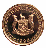 The proof series consisted of four different coins: 1 mark, 1 dollar (both in copper/nickel), 10 marks and 10 dollars (both in silver). The obverse of the mark pieces shows a sitting lion where the dollar pieces depict a San (Bushman) with bow and arrow. All obverse sides bear the indication of denomination as well as the remark ‘PROBE’/‘ESSAI’ (proof). The reverse of the 1-mark/1-dollar pieces shows Namibia's former coat of arms surrounded by the inscription ‘NAMIBIA’, the year (1990) and two ears of corn. The ten-mark/ten-dollar pieces bear the inscription ‘INDEPENDENCE’/‘UNABHÄNGIGKEIT’ ("independence" in German) instead of the ears.