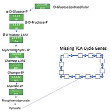 Sequencing of the M. pneumoniae genome in 1996 revealed it is 816,394 bp in size.[2] The genome contains 687 genes that encode for proteins, of which about 56.6% code for essential metabolic enzymes; notably those involved in glycolysis and organic acid fermentation.[1][2][3][5] M. pneumoniae is consequently very susceptible to loss of enzymatic function by gene mutations, as the only buffering systems against functional loss by point mutations are for maintenance of the pentose phosphate pathway and nucleotide metabolism.[5] Loss of function in other pathways is suggested to be compensated by host cell metabolism.[5] In addition to the potential for loss of pathway function, the reduced genome of M. pneumoniae outright lacks a number of pathways, including the TCA cycle, respiratory electron transport chain, and biosynthesis pathways for amino acids, fatty acids, cholesterol and purines and pyrimidines.[1][3][5] These limitations make M. pneumoniae dependent upon import systems to acquire essential building blocks from their host or the environment that cannot be obtained through glycolytic pathways.[3][5] Along with energy costly protein and RNA production, a large portion of energy metabolism is exerted to maintain proton gradients (up to 80%) due to the high surface area to volume ratio of M. pneumoniae cells. Only 12 – 29% of energy metabolism is directed at cell growth, which is unusually low for bacterial cells, and is thought to be an adaptation of its parasitic lifestyle.[5]