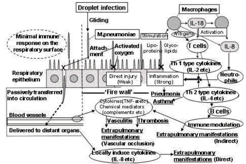 Mycoplasma pneumoniae is known to evade host immune system detection, resist antibiotic treatment, and cross mucosal barriers, which may be due to its ability to fuse with host cells and survive intracellularly.[1][4] In addition to the close physical proximity of M. pneumoniae and host cells, the lack of cell wall and peculiar cell membrane components, like cholesterol, may facilitate fusion (1). Internal localization may produce chronic or latent infections as M. pneumoniae is capable of persisting, synthesizing DNA, and replicating within the host cell even after treatment with antibiotics.[4] The exact mechanism of intracellular localization is unknown, however the potential for cytoplasmic sequestration within the host explains the difficulty in completely eliminating M. pneumoniae infections in afflicted individuals.[1]