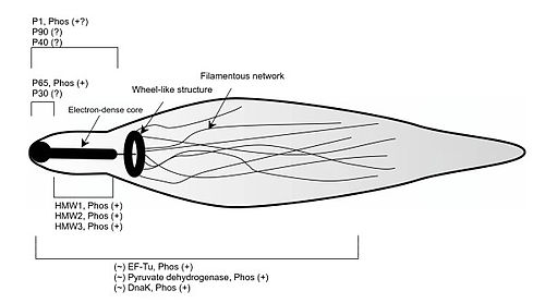 Adherence of M. pneumoniae to a host cell (usually a respiratory tract cell, but occasionally an erythrocyte or urogenital lining cell) is the initiating event for pneumonic disease and related symptoms.[1] The specialized attachment organelle is a polar, electron dense and elongated cell extension that facilitates motility and adherence to host cells.[1][3] It is composed of a central filament surrounded by an intracytoplasmic space, along with a number of adhesins and structural and accessory proteins localized at the tip of the organelle.[1][3] A variety of proteins are known to contribute to the formation and functionality of the attachment organelle, including the accessory proteins HMW1–HMW5, P30, P56, and P90 that confer structure and adhesin support, and P1, P30 and P116 which are involved directly in attachment.[1][10][11] This network of proteins participates not only in the initiation of attachment organelle formation and adhesion but also in motility.[11] The P1 adhesin (trypsin-sensitive protein) is a 120 kDa protein highly clustered on the surface of the attachment organelle tip in virulent mycoplasmas.[1][11][12] Both the presence of P1 and its concentration on the cell surface are required for the attachment of M. pneumoniae to the host cell. M. pneumoniae cells treated with monoclonal antibodies specific to the immunogenic C-terminus of the P1 adhesin have been shown to be inhibited in their ability to attach to the host cell surface by approximately 75%, suggesting P1 is a major component in adherence.[1][10][11] These antibodies also decreased the ability of the cell to glide quickly, which may contribute to decreased adherence to the host by hindering their capacity to locate a host cell.[10] Furthermore, mutations in P1 or degradation by trypsin treatment yield avirulent M. pneumoniae cells.[1] Loss of proteins in the cytoskeleton involved in the localization of P1 in the tip structure, such as HMW1–HMW3, also cause avirulence due to the lack of adhesin clustering.[11][12] Another protein considered to play an important role in adherence is P30, as M. pneumoniae cells with mutations in this protein or that have had antibodies raised against P30 are incapable of adhering to host cells.[1][3] P30 is not involved in the localization of P1 in the tip structure since P1 is trafficked to the attachment organelle in P30 mutants, but rather it may function as a receptor-binding accessory adhesin.[3][12] P30 mutants also display distinct morphological features such as multiple lobes and a rounded shape as opposed to elongated, which suggests P30 may interact with the cytoskeleton during formation of the attachment organelle.[3] A number of eukaryotic cell surface components have been implicated in the adherence of M. pneumoniae cells to the respiratory tract epithelium. Among them are sialoglycoconjugates, sulfated glycolipids, glycoproteins, fibronectin, and neuraminic acid receptors.[1][10][13] Lectins on the surface of the bacterial cells are capable of binding oligosaccharide chains on glycolipids and glycoproteins to facilitate attachment, in addition to the proteins TU and pyruvate dehydrogenase E1 β, which bind to fibronectin.[1][10]