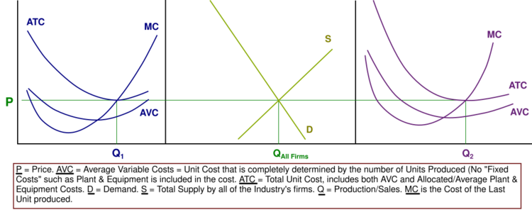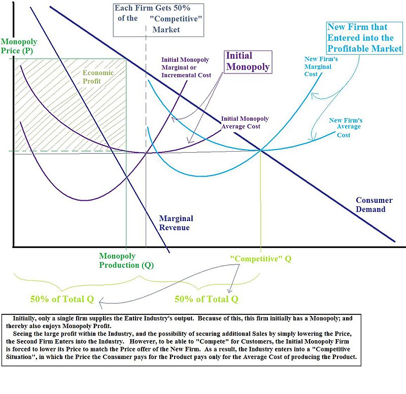 Without barriers to entry and collusion in a market, the existence of a monopoly and monopoly profit cannot persist in the long run.[1][3] Normally, when economic profit exists within an industry, economic agents form new firms in the industry to obtain at least a portion of the existing economic profit.[1][4] As new firms enter the industry, they increase the supply of the product available in the market, and they are forced to charge a lower price to entice consumers to buy the additional supply they are supplying as competition.[1][4][2][3] Since consumers flock toward the lowest price (in search of a bargain), older firms within the industry may lose their existing customers to the new firms entering the industry, and are forced to lower their prices to match the prices set by the new firms.[1][4][3][6] New firms continue to enter the industry until the price of the product is lowered to the point that it is the same as the average economic cost of producing the product, and economic profit disappears.[1][4] When this happens, economic agents outside of the industry find no advantage to entering the industry, supply of the product stops increasing, and the price charged for the product stabilizes.[1][4][2]