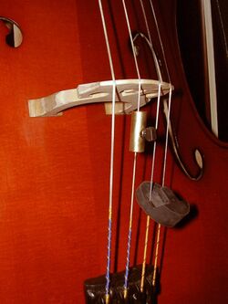Frequently, the wolf is present on or in between the pitches E and F♯ on the cello, and around G♯ on the double bass.[4][5] A wolf can be reduced or eliminated with a piece of equipment called a wolf tone eliminator. There are several types. The one illustrated is a metal tube and mounting screw with an interior rubber sleeve, that fits around one of the lengths of string below the bridge. The position of the tube must be adjusted so that the short section of string resonates exactly at the frequency at which the wolf occurs. It works in the same way as a tuned-mass damper, often used to reduce vibration of bridges or tall buildings.