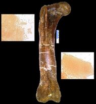 In the March 2005 issue of Science, Mary Higby Schweitzer of North Carolina State University and colleagues announced the recovery of soft tissue from the marrow cavity of a fossilized leg bone from a T. rex. The bone had been intentionally, though reluctantly, broken for shipping and then not preserved in the normal manner, specifically because Schweitzer was hoping to test it for soft tissue.[146] Designated as the Museum of the Rockies specimen 1125, or MOR 1125, the dinosaur was previously excavated from the Hell Creek Formation. Flexible, bifurcating blood vessels and fibrous but elastic bone matrix tissue were recognized. In addition, microstructures resembling blood cells were found inside the matrix and vessels. The structures bear resemblance to ostrich blood cells and vessels. Whether an unknown process, distinct from normal fossilization, preserved the material, or the material is original, the researchers do not know, and they are careful not to make any claims about preservation.[147] If it is found to be original material, any surviving proteins may be used as a means of indirectly guessing some of the DNA content of the dinosaurs involved, because each protein is typically created by a specific gene. The absence of previous finds may be the result of people assuming preserved tissue was impossible, therefore not looking. Since the first, two more tyrannosaurs and a hadrosaur have also been found to have such tissue-like structures.[146] Research on some of the tissues involved has suggested that birds are closer relatives to tyrannosaurs than other modern animals.[148]