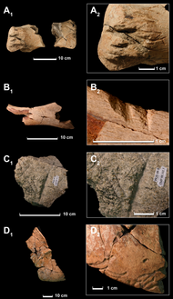 Rare fossil footprints and trackways found in New Mexico and Wyoming that are assigned to the ichnogenus Tyrannosauripus have been attributed to being made by Tyrannosaurus, based on the stratigraphic age of the rocks they are preserved in. The first specimen, found in 1994 was described by Lockley and Hunt and consists of a single, large footprint. Another pair of ichnofossils, described in 2021, show a large tyrannosaurid rising from a prone position by rising up using its elbows in conjunction with the pads on their feet to stand. These two unique sets of fossils were found in Ludlow, Colorado and Cimarron, New Mexico.[166] Another ichnofossil described in 2018, perhaps belonging to a juvenile Tyrannosaurus or the dubious genus Nanotyrannus was uncovered in the Lance Formation of Wyoming. The trackway itself offers a rare glimpse into the walking speed of tyrannosaurids, and the trackmaker is estimated to have been moving at a speed of Lua error: Internal error: The interpreter exited with status 1., significantly faster than previously assumed for estimations of walking speed in tyrannosaurids.[167][168]