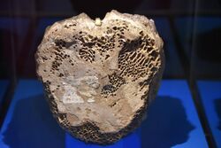 The presumed soft tissue was called into question by Thomas Kaye of the University of Washington and his co-authors in 2008. They contend that what was really inside the tyrannosaur bone was slimy biofilm created by bacteria that coated the voids once occupied by blood vessels and cells.[150] The researchers found that what previously had been identified as remnants of blood cells, because of the presence of iron, were actually framboids, microscopic mineral spheres bearing iron. They found similar spheres in a variety of other fossils from various periods, including an ammonite. In the ammonite, they found the spheres in a place where the iron they contain could not have had any relationship to the presence of blood.[151] Schweitzer has strongly criticized Kaye's claims and argues that there is no reported evidence that biofilms can produce branching, hollow tubes like those noted in her study.[152] San Antonio, Schweitzer and colleagues published an analysis in 2011 of what parts of the collagen had been recovered, finding that it was the inner parts of the collagen coil that had been preserved, as would have been expected from a long period of protein degradation.[153] Other research challenges the identification of soft tissue as biofilm and confirms finding "branching, vessel-like structures" from within fossilized bone.[154]