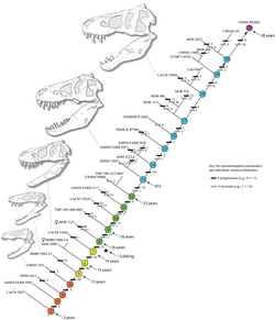 A 2020 study by Holly Woodward and colleagues showed the specimens referred to Nanotyrannus were all ontogenetically immature and found it probable that these specimens belonged to T. rex.[96] The same year, Carr published a paper on T. rex's growth history, finding that CMNH 7541 fit within the expected ontogenetic variation of the taxon and displayed juvenile characteristics found in other specimens. It was classified as a juvenile, under 13 years old with a skull less than Lua error: Internal error: The interpreter exited with status 1.. No significant sexual or phylogenetic variation was discernible among any of the 44 specimens studied, with Carr stating that characters of potential phylogenetic importance decrease throughout age at the same rate as growth occurs.[97] Discussing the paper's results, Carr described how all "Nanotyrannus" specimens formed a continual growth transition between the smallest juveniles and the subadults, unlike what would be expected if it were a distinct taxon where the specimens would group to the exclusion of Tyrannosaurus. Carr concluded that "the 'nanomorphs' are not all that similar to each other and instead form an important bridge in the growth series of T. rex that captures the beginnings of the profound change from the shallow skull of juveniles to the deep skull that is seen in fully-developed adults."[98]