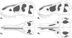 Even if T. rex does exhibit evidence of homeothermy, it does not necessarily mean that it was endothermic. Such thermoregulation may also be explained by gigantothermy, as in some living sea turtles.[142][143][144] Similar to contemporary crocodilians, openings (dorsotemporal fenestrae) in the skull roofs of Tyrannosaurus may have aided thermoregulation.[145]