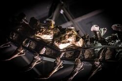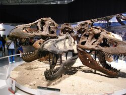 Additional support of tyrannosaurid gregariousness can be found in fossilized trackways from the Upper Cretaceous Wapiti Formation of northeastern British Columbia, Canada, left by three tyrannosaurids traveling in the same direction.[182][183] According to scientists assessing the Dino Gangs program, the evidence for pack hunting in Tarbosaurus and Albertosaurus is weak and based on group skeletal remains for which alternate explanations may apply (such as drought or a flood forcing dinosaurs to die together in one place).[180] Others researchers have speculated that instead of large theropod social groups, some of these finds represent behavior more akin to Komodo dragon-like mobbing of carcasses, even going as far as to say true pack-hunting behavior may not exist in any non-avian dinosaurs due to its rarity in modern predators.[184]