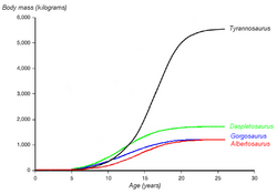 Histology has also allowed the age of other specimens to be determined. Growth curves can be developed when the ages of different specimens are plotted on a graph along with their mass. A T. rex growth curve is S-shaped, with juveniles remaining under Lua error: Internal error: The interpreter exited with status 1. until approximately 14 years of age, when body size began to increase dramatically. During this rapid growth phase, a young T. rex would gain an average of Lua error: Internal error: The interpreter exited with status 1. a year for the next four years. At 18 years of age, the curve plateaus again, indicating that growth slowed dramatically. For example, only Lua error: Internal error: The interpreter exited with status 1. separated the 28-year-old Sue from a 22-year-old Canadian specimen (RTMP 81.12.1).[39] A 2004 histological study performed by different workers corroborates these results, finding that rapid growth began to slow at around 16 years of age.[100]