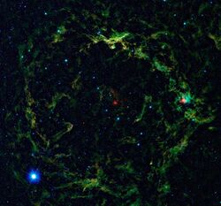 Meissa is surrounded by a ring of nebulosity about 12 degrees across. It is thought to be the remains of a supernova explosion, now ionized by the ultraviolet radiation from Meissa itself and some of the surrounding hot stars.[22]