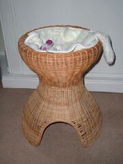 Wicker can also be made from synthetic materials, or a combination. In furniture, such as benches, chairs, stools and other seating devices, a frame is typically made of stiffer materials, after which more pliant material is woven into the frame to fill it.[12] In a smaller piece such as a basket, a strengthening frame is not needed so the entire piece is woven from the wicker material.[13]
