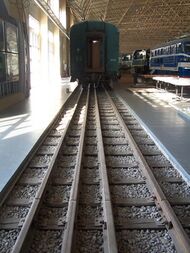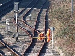 The most common use of the term "track gauge" refers to the transverse distance between the inside surfaces of the two load-bearing rails of a railway track, usually measured at 12.7 millimetres (0.50 inches) to 15.9 millimetres (0.63 inches) below the top of the rail head in order to clear worn corners and allow for rail heads having sloping sides.[1] The term derives from the "gauge", a metal bar with a precisely positioned lug at each end that track crews use to ensure the actual distance between the rails lies within tolerances of a prescribed standard: on curves, for example, the spacing is wider than normal.[2] Deriving from the name of the bar, the distance between these rails is also referred to as the track gauge.[3]
