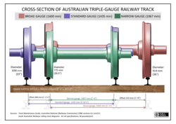 | 1,067 mm (3 ft 6 in) | Three foot six inch gauge | 112,000 | 70,000 | 8.5% | Southern and Central Africa; Nigeria (most); Indonesia (Java and Sumatera) ; Japan; Taiwan; Philippines; New Zealand; and the Australian states of Queensland, Western Australia, Tasmania and South Australia. |