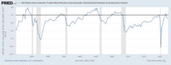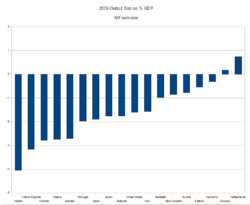 The GDP gap or the output gap is the difference between actual GDP or actual output and potential GDP, in an attempt to identify the current economic position over the business cycle. The measure of output gap is largely used in macroeconomic policy (in particular in the context of EU fiscal rules compliance). The GDP gap is a highly criticized notion, in particular due to the fact that the potential GDP is not an observable variable, it is instead often derived from past GDP data, which could lead to systemic downward biases.[3][4][5][6]