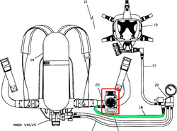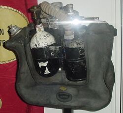 An SCBA typically has three main components: a high-pressure tank (e.g., 2,216 to 5,500 psi (15,280 to 37,920 kPa), about 150 to 374 atmospheres), a pressure regulator, and an inhalation connection (mouthpiece, mouth mask or face mask), connected together and mounted to a carrying frame.[1]