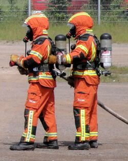 The Royal Australian Navy uses the open circuit compressed air breathing apparatus (OCCABA), a backpack-style, positive pressure breathing apparatus, for firefighting roles.