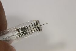 Sharps containers are devices used to collect small, sharp objects safely. The purpose of this is to properly dispose of contaminated items to limit exposure to workers nearby. These items often include needles, lancets, suture needles, and scalpels. These containers can collect broken glass for general disposal. However, general broken glass and needles potentially containing bloodborne pathogens should not be mixed and must be disposed of separately.[22]