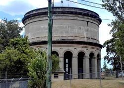Service reservoirs store fully treated potable water close to the point of distribution.[11] Many service reservoirs are constructed as water towers, often as elevated structures on concrete pillars where the landscape is relatively flat. Other service reservoirs can be storage pools, water tanks or sometimes entirely underground cisterns, especially in more hilly or mountainous country. Modern reserviors will often use geomembrane liners on their base to limit seepage and/or as floating covers to limit evaporation, particularly in arid climates. In the United Kingdom, Thames Water has many underground reservoirs built in the 1800s, most of which are lined with brick. A good example is the Honor Oak Reservoir in London, constructed between 1901 and 1909. When it was completed it was said to be the largest brick built underground reservoir in the world[12] and it is still one of the largest in Europe.[13] This reservoir now forms part of the southern extension of the Thames Water Ring Main. The top of the reservoir has been grassed over and is now used by the Aquarius Golf Club.[14]