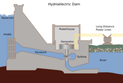 In 2005, about 25% of the world's 33,105 large dams (over 15 metres in height) were used for hydroelectricity.[23] The U.S. produces 3% of its electricity from 80,000 dams of all sizes. An initiative is underway to retrofit more dams as a good use of existing infrastructure to provide many smaller communities with a reliable source of energy.[24] A reservoir generating hydroelectricity includes turbines connected to the retained water body by large-diameter pipes. These generating sets may be at the base of the dam or some distance away. In a flat river valley a reservoir needs to be deep enough to create a head of water at the turbines; and if there are periods of drought the reservoir needs to hold enough water to average out the river's flow throughout the year(s). Run-of-the-river hydro in a steep valley with constant flow needs no reservoir.