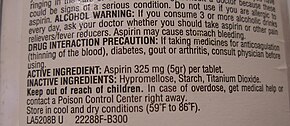 Like its ability to control pain, aspirin's ability to control fever is due to its action on the prostaglandin system through its irreversible inhibition of COX.[38] Although aspirin's use as an antipyretic in adults is well established, many medical societies and regulatory agencies, including the American Academy of Family Physicians, the American Academy of Pediatrics, and the Food and Drug Administration, strongly advise against using aspirin for treatment of fever in children because of the risk of Reye's syndrome, a rare but often fatal illness associated with the use of aspirin or other salicylates in children during episodes of viral or bacterial infection.[39][40][41] Because of the risk of Reye's syndrome in children, in 1986, the US Food and Drug Administration (FDA) required labeling on all aspirin-containing medications advising against its use in children and teenagers.[42]