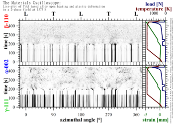 Two-dimensional diffraction images of a fine synchrotron beam interacting with the specimen are recorded in time frames, such that reflections stemming from individual crystallites of the polycrystalline material can be distinguished. Data treatment is undertaken in a way that diffraction rings are straightened and presented line by line streaked in time.[3] The traces, so-called timelines in azimuthal-angle/time plots resemble to traces of an oscilloscope, giving insight on the processes happening in the material, while undergoing plastic deformation, or heating, or both,[4][5][6][7][8][9][10] These timelines allow to distinguish grain growth or refinement, subgrain formation, slip deformation systems, crystallographic twinning, dynamic recovery, dynamic recrystallization, simultaneously in multiple phases.