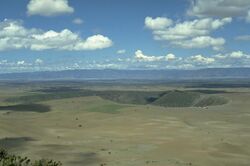 The most prominent volcanic centres of the field are the La Breña-El Jagüey maars. They form intersected craters and the larger Brena crater has cinder cones within.[1] The diameter of the Brena maar is 1,400 metres (4,600 ft) and Jagüey 700 metres (2,300 ft), rising above a 2,000 metres (6,600 ft) high lava plain. Each maar is surrounded by a tuff ring 30–70 metres (98–230 ft) high. Jaguey presently holds a permanent lake and the formation of both maars was probably influenced by groundwater. Jaguey maar likely formed first, with the Brena maar forming eruption generating surge fields. The formation of the maars has partly buried some neighbouring cinder cones.[6] Other cones in the field may date back to Pliocene-Pleistocene times given their state of degradation; one K-Ar date is 0.8 mya.[5]