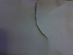 Tearing is the act of breaking apart a material by force, without the aid of a cutting tool. A tear in a piece of paper, fabric, or some other similar object may be the result of the intentional effort with one's bare hands, or be accidental. Unlike a cut, which is generally on a straight or patterned line controlled by a tool such as scissors, a tear is generally uneven and, for the most part, unplanned. An exception is a tear along a perforated line, as found on a roll of toilet paper or paper towels, which has been previously partially cut, so the effort of tearing will probably produce a straight line.